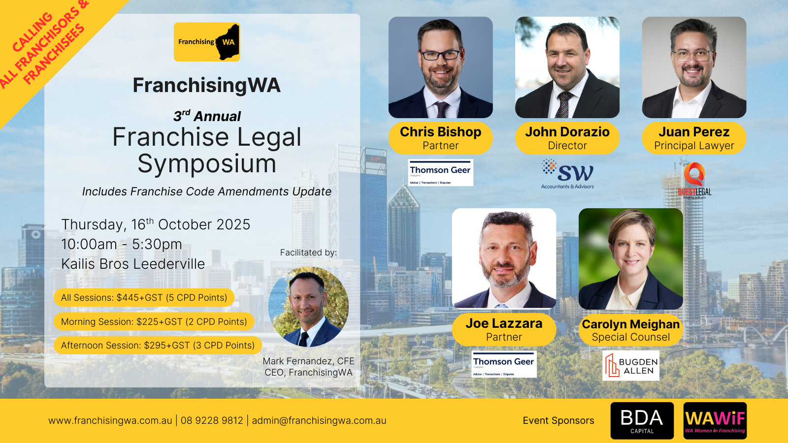 The FranchisingWA Franchise Legal Symposium is the premier gathering for WA’s franchising community to stay informed, connected, and ahead of change.